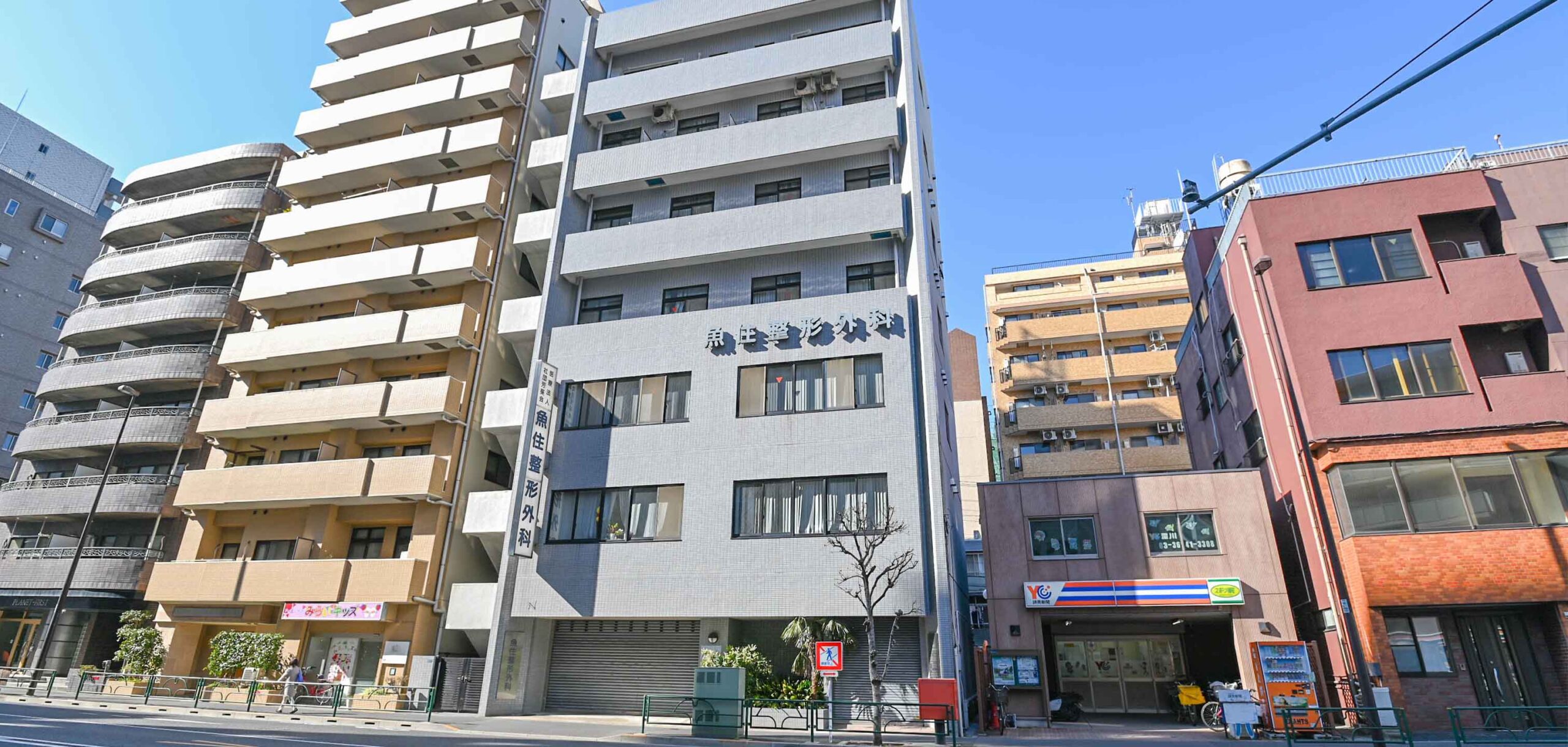 グレーの7階建ての建物です。門前仲町駅3番出口から徒歩約4分と駅から近く通院しやすい立地にあります。